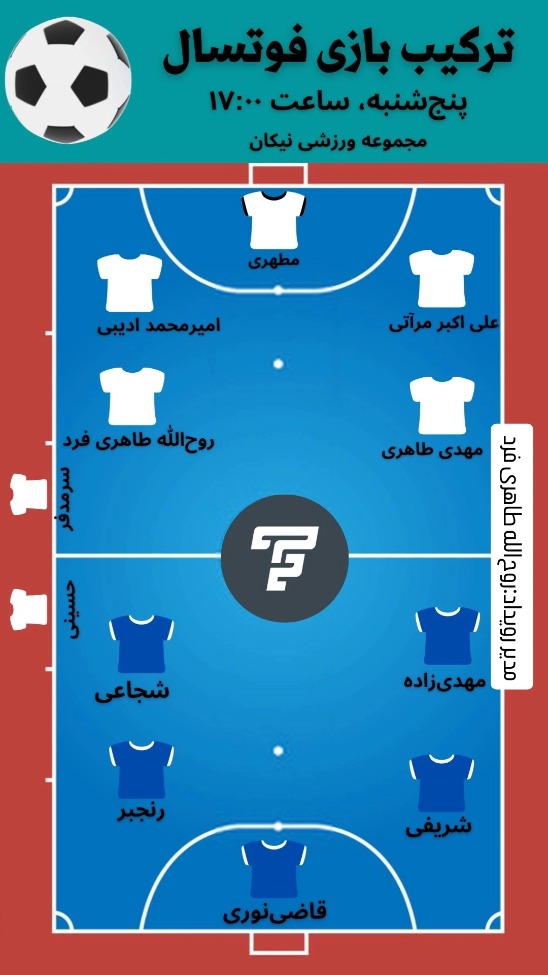 | توضیحات: | بازی در سالن بالا می باشد. لطفاً تیم سی پلاس (تیم اول) رنگ سفید و تیم فوتسال تیموفیت (تیم دوم) رنگ تیره (ترجیحا سرمه ای) بپوشند. لطفا به موقع تشریف بیاورید. |