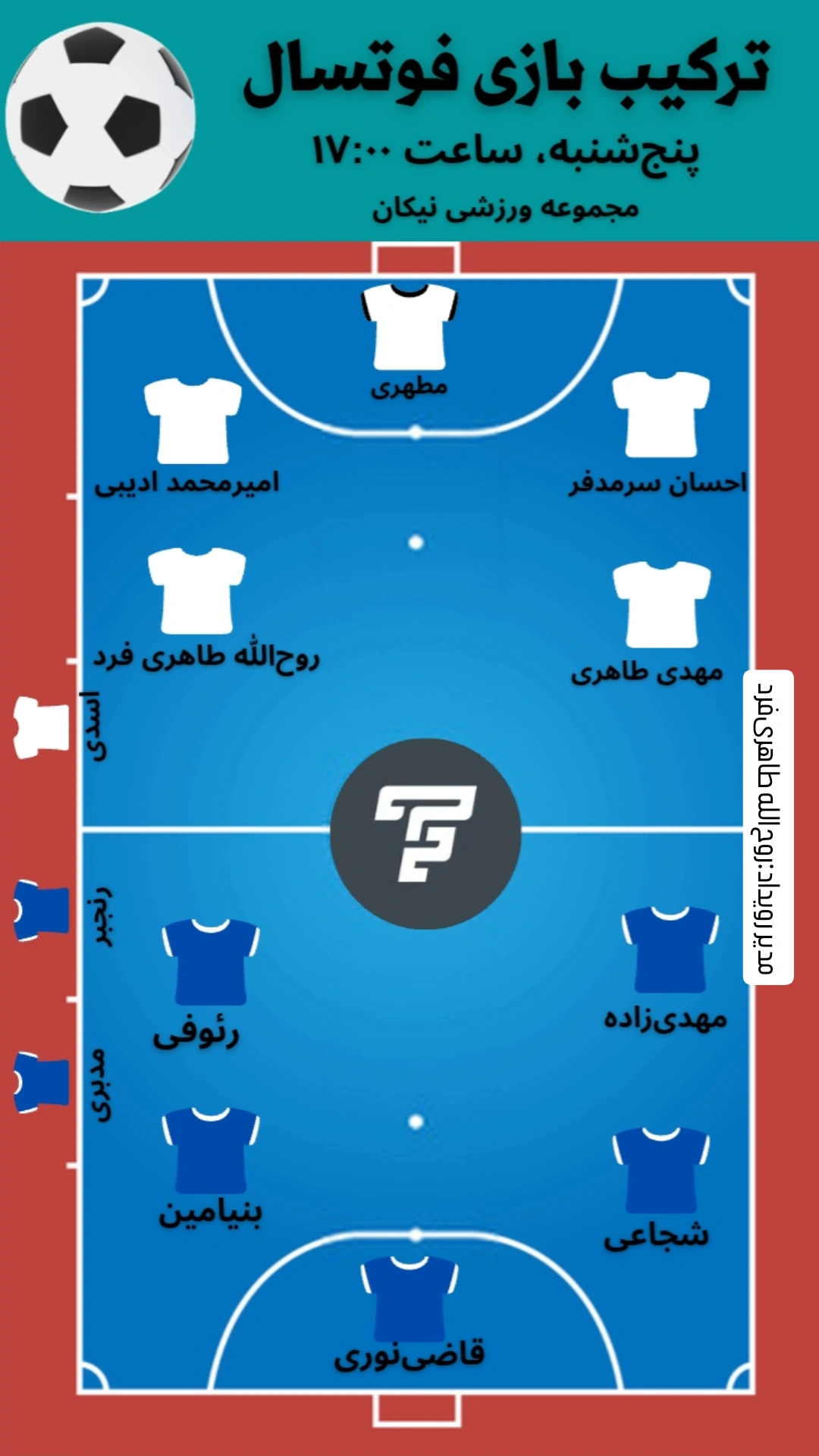 | توضیحات: | بازی در سالن بالا می باشد. لطفاً تیم سی پلاس (تیم اول) رنگ سفید و تیم فوتسال تیموفیت (تیم دوم) رنگ تیره (ترجیحا سرمه ای) بپوشند. لطفا به موقع تشریف بیاورید. |