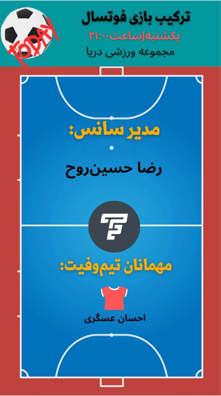 | توضیحات: | لطفا یک ربع زودتر تشریف بیاورید و دو رنگ سفید و سرمه ای همراه خود داشته باشید. هر تیم 5 نفر. 1 تا 2 نفر ذخیره. |